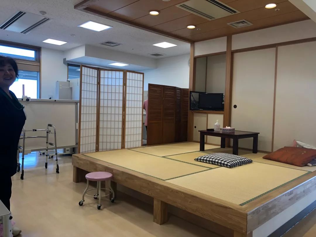 首先引起關(guān)注的是一個模擬的日本和室。這是按典型的日本傳統(tǒng)客廳尺寸模擬出來,醫(yī)護(hù)人員會輔助患者在未來的身體狀態(tài)下,如何能在家里自理: