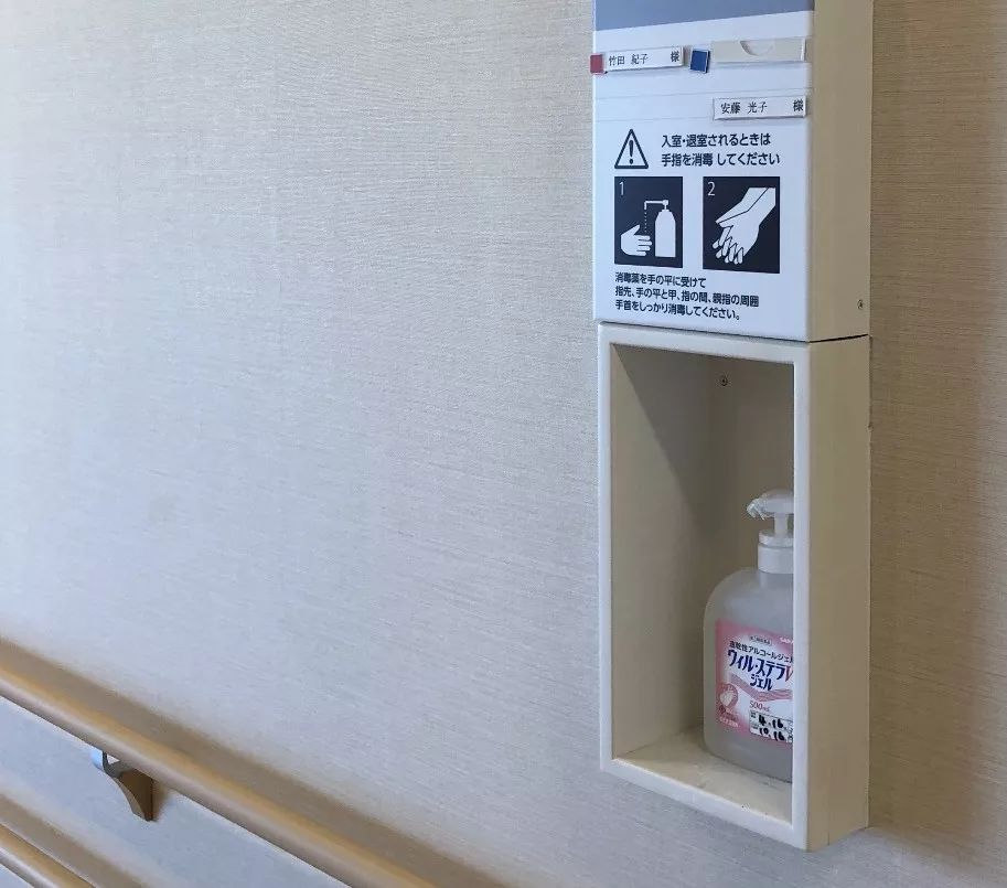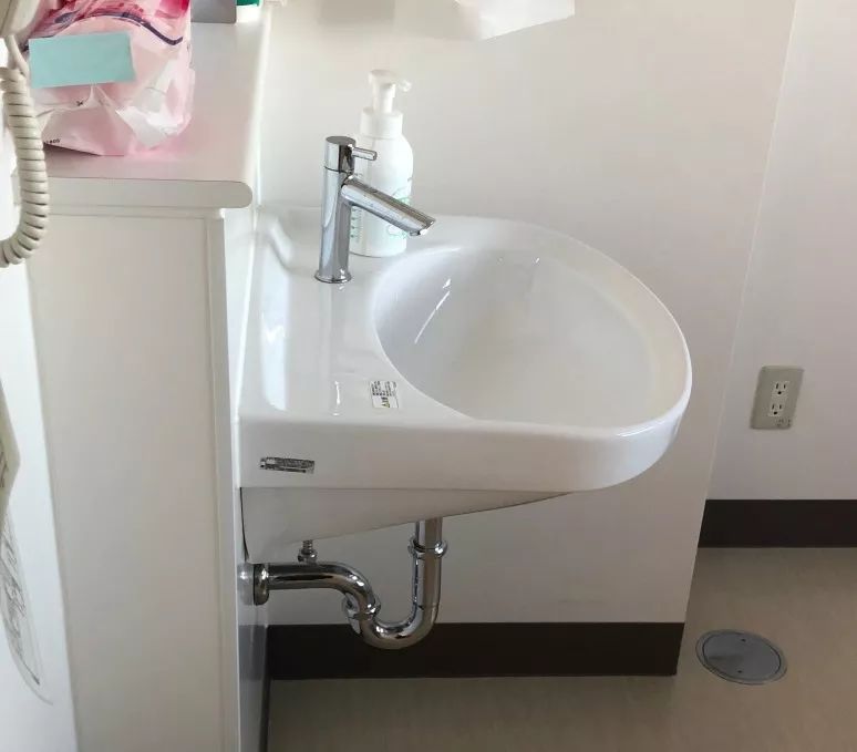 病房前的空間都配有洗手池,門牌下放置消毒液的小凹槽。由于固定的皂液機(jī)與墻面固定的位置沒法清洗,放這種瓶裝的似乎更為衛(wèi)生,添加消毒液時也更為方便。