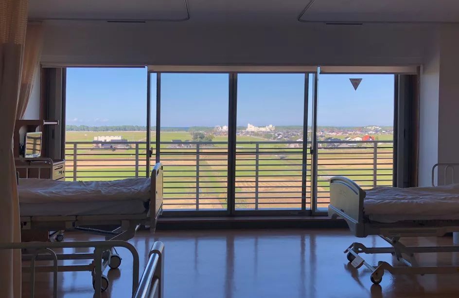 病房里的落地玻璃,將陽光及景觀最大化。天氣好的時候還可以步出小陽臺吹吹風(fēng)。外面是一大片農(nóng)田,遠(yuǎn)處還可以看到大海: