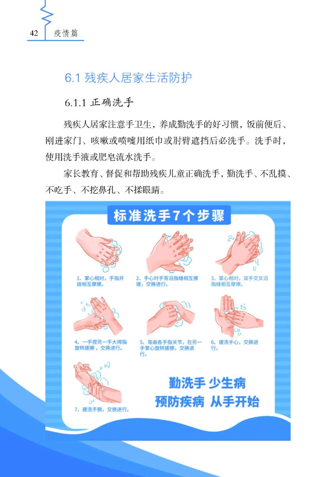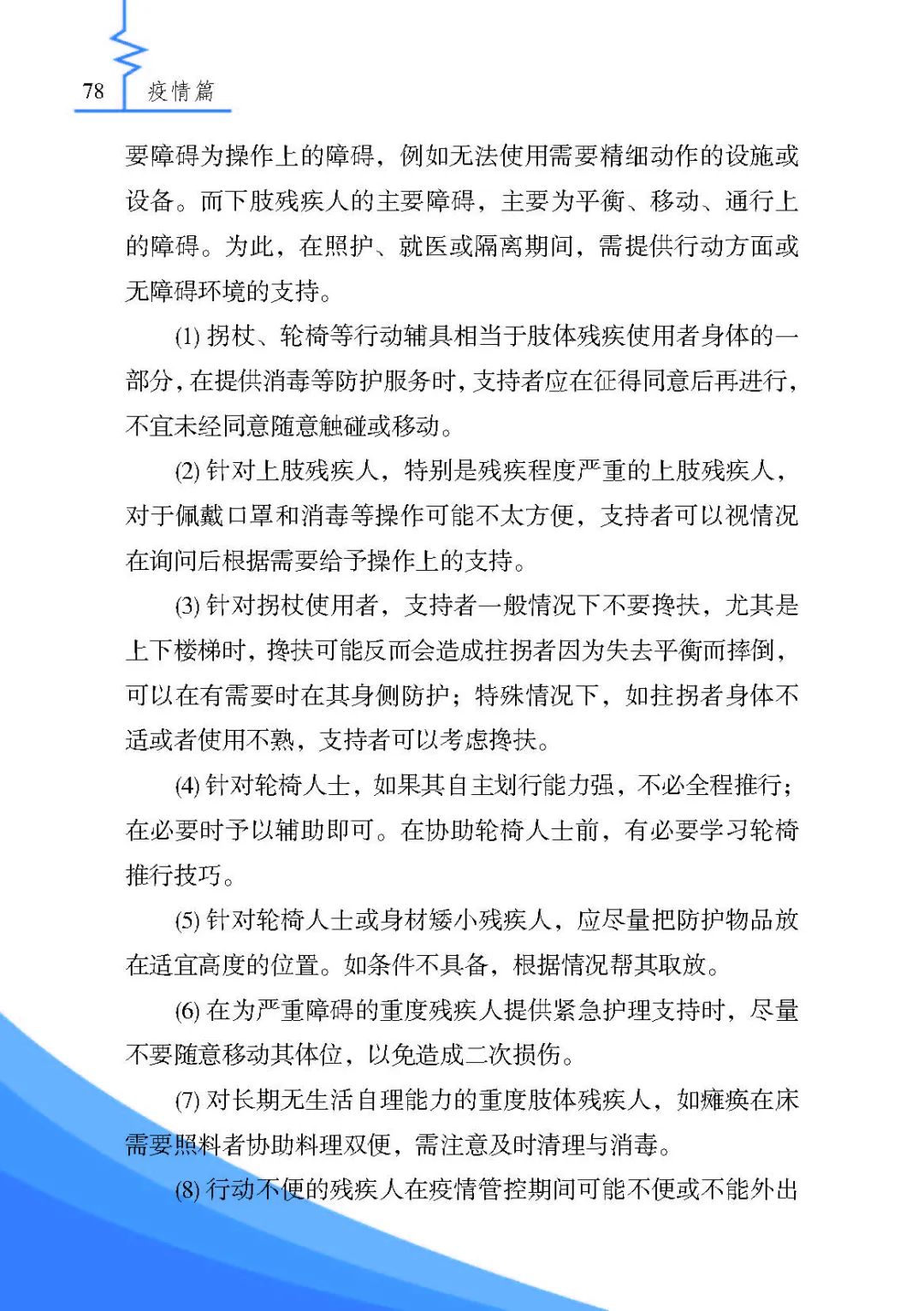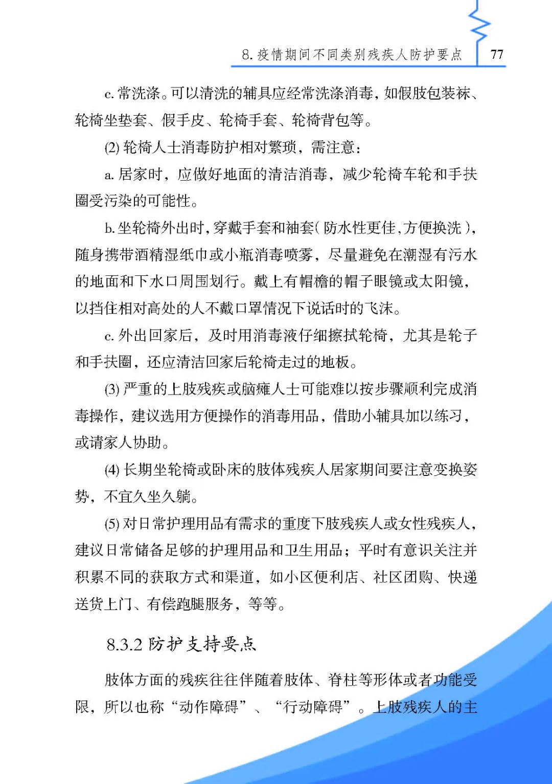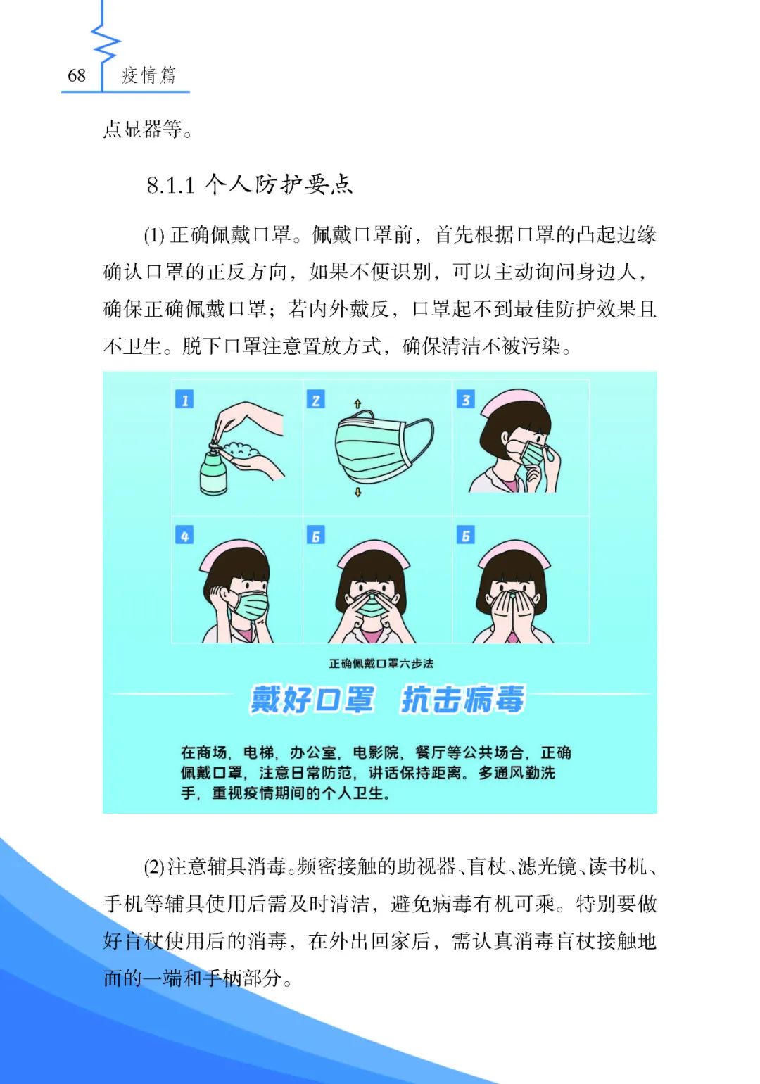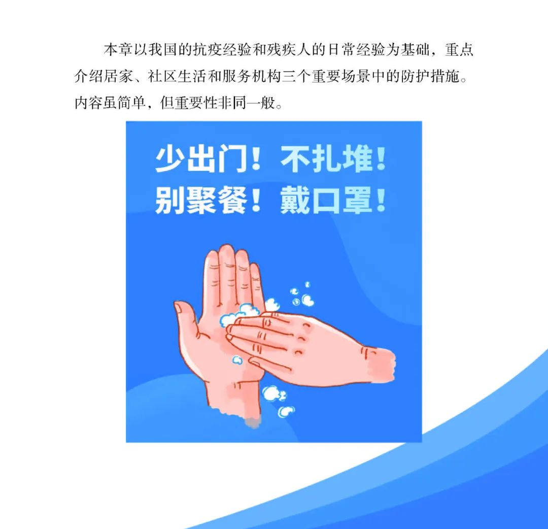 疫情給殘疾人帶來(lái)了身心健康、照護(hù)、經(jīng)濟(jì)等多方面的挑戰(zhàn),日常生活中,殘疾人應(yīng)如何做好防護(hù)呢?為做好殘疾人群體疫情防控工作,幫助殘疾人朋友科學(xué)防疫,當(dāng)好自己健康的第一責(zé)任人,中國(guó)殘疾人聯(lián)合會(huì)組織編寫了《殘疾人安全防護(hù)實(shí)用手冊(cè)·疫情篇》。