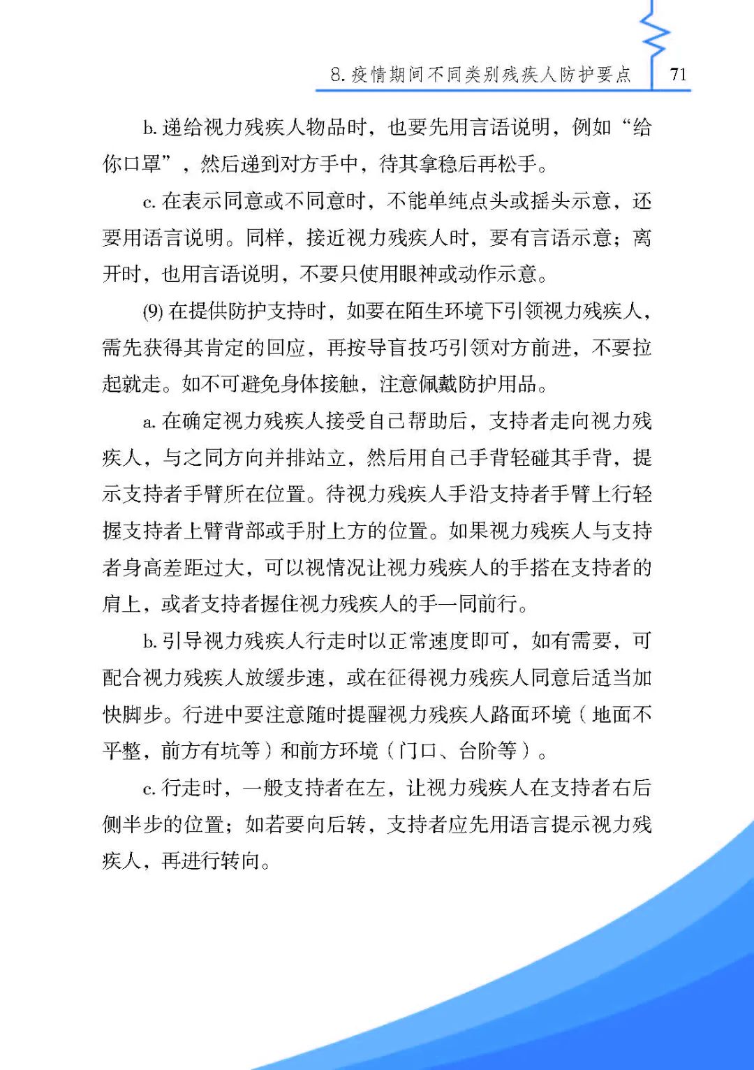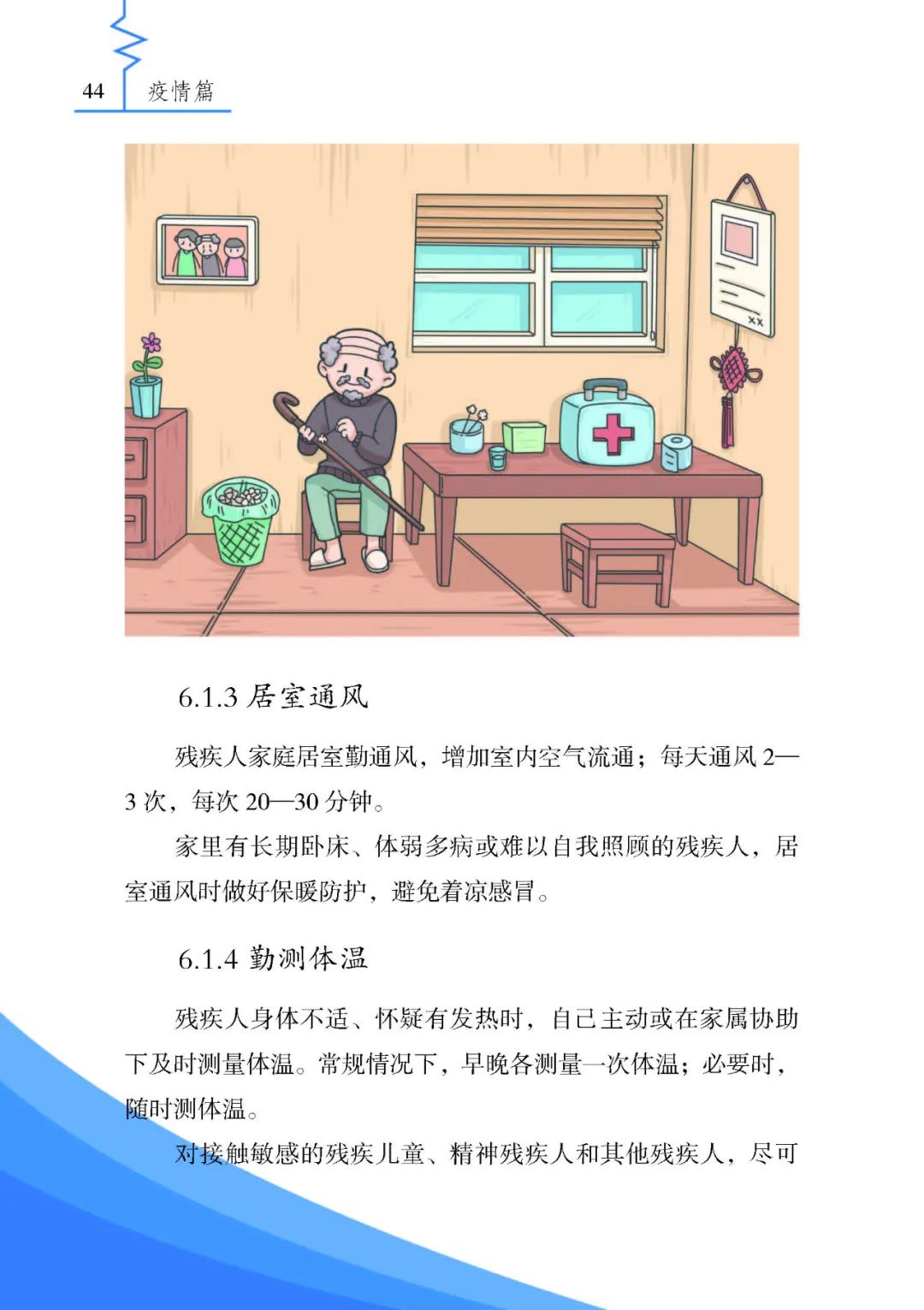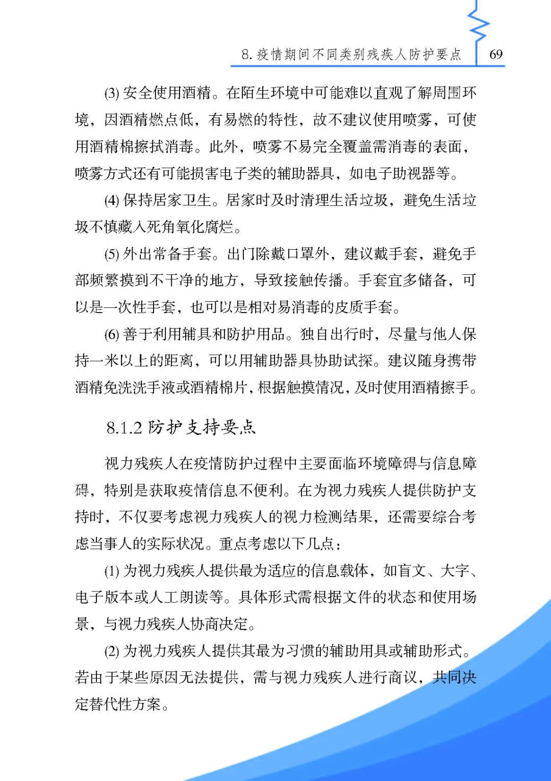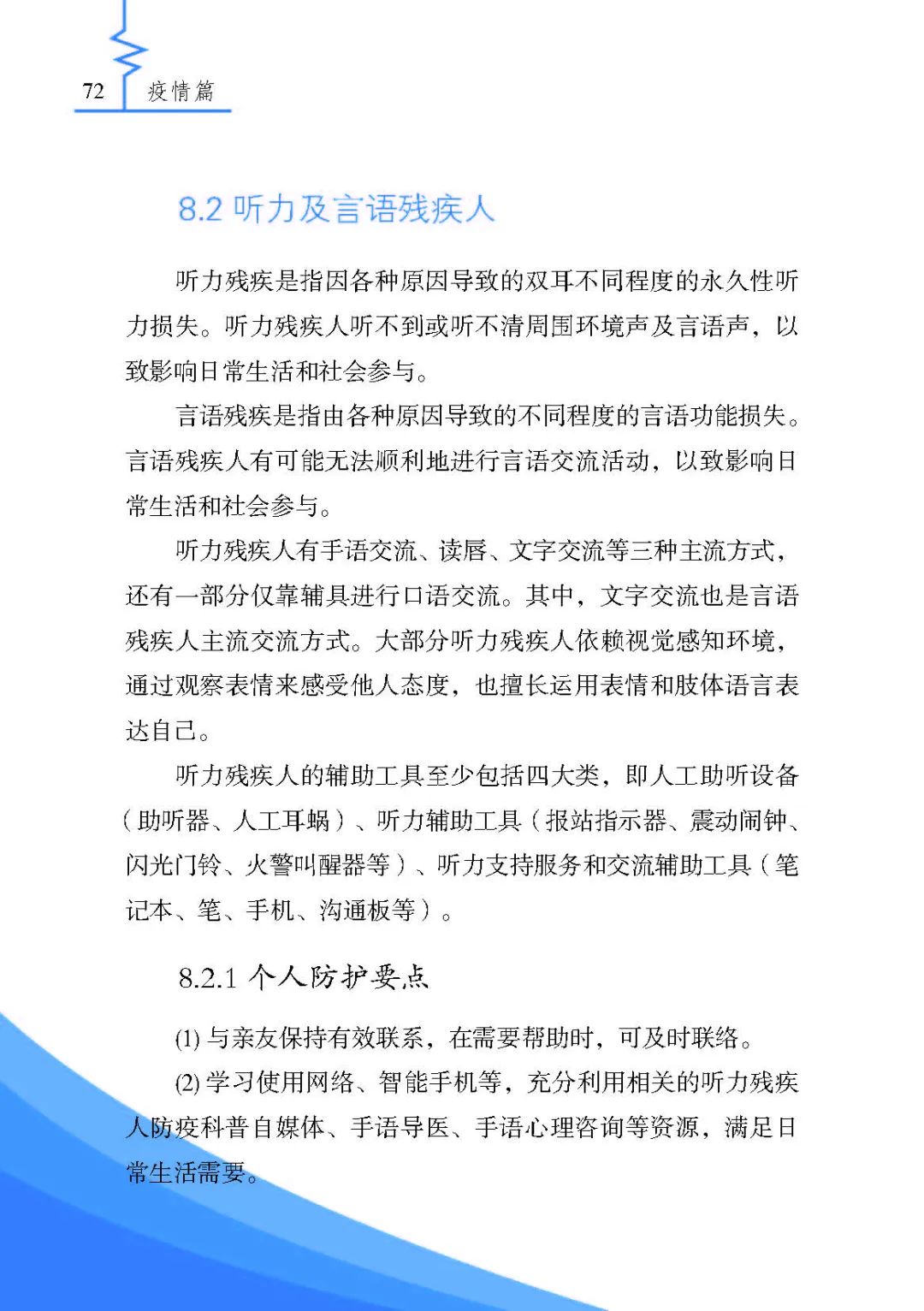 疫情給殘疾人帶來(lái)了身心健康、照護(hù)、經(jīng)濟(jì)等多方面的挑戰(zhàn),日常生活中,殘疾人應(yīng)如何做好防護(hù)呢?為做好殘疾人群體疫情防控工作,幫助殘疾人朋友科學(xué)防疫,當(dāng)好自己健康的第一責(zé)任人,中國(guó)殘疾人聯(lián)合會(huì)組織編寫了《殘疾人安全防護(hù)實(shí)用手冊(cè)·疫情篇》。