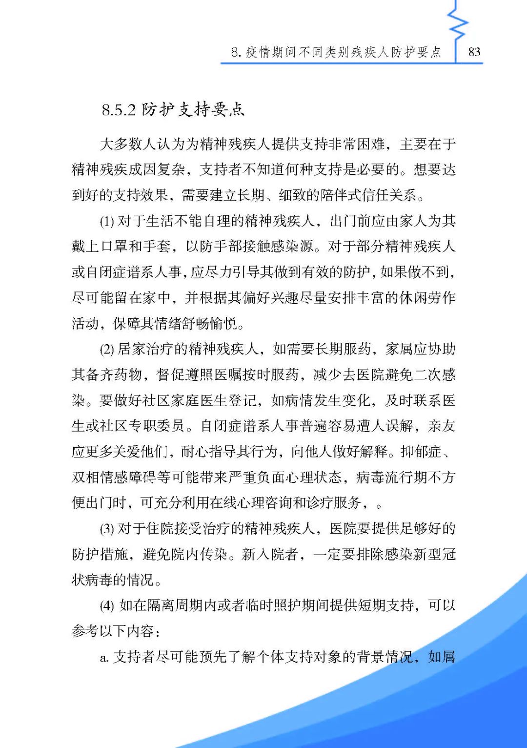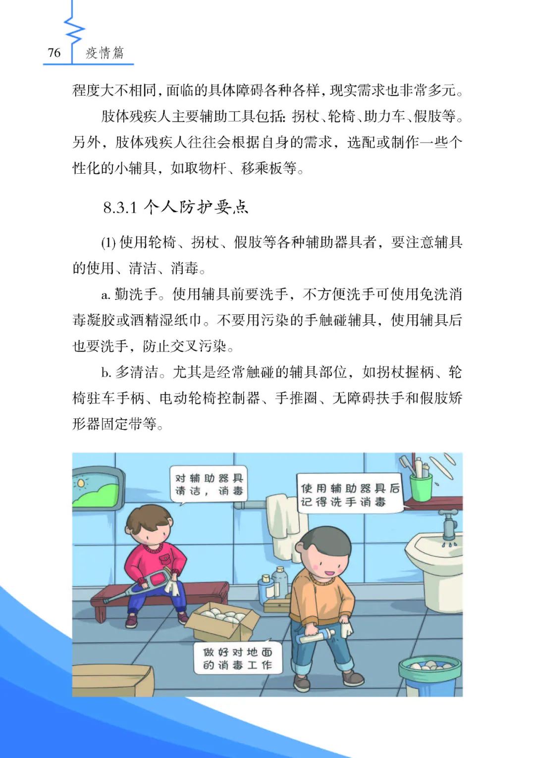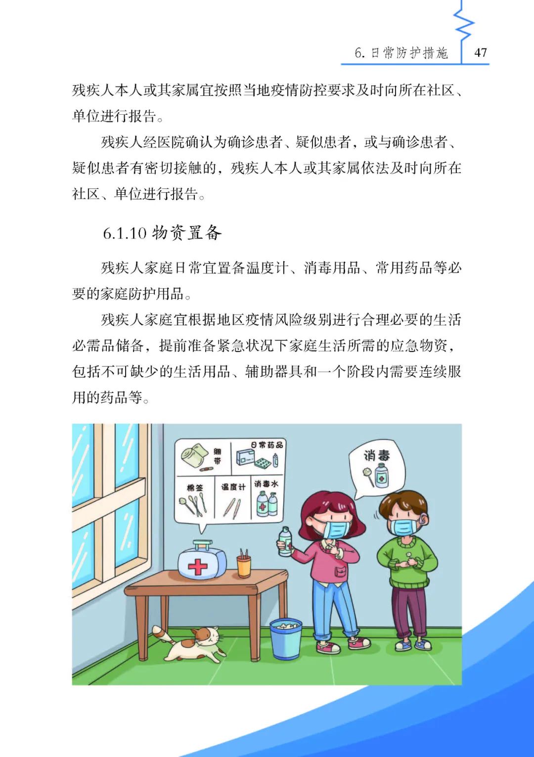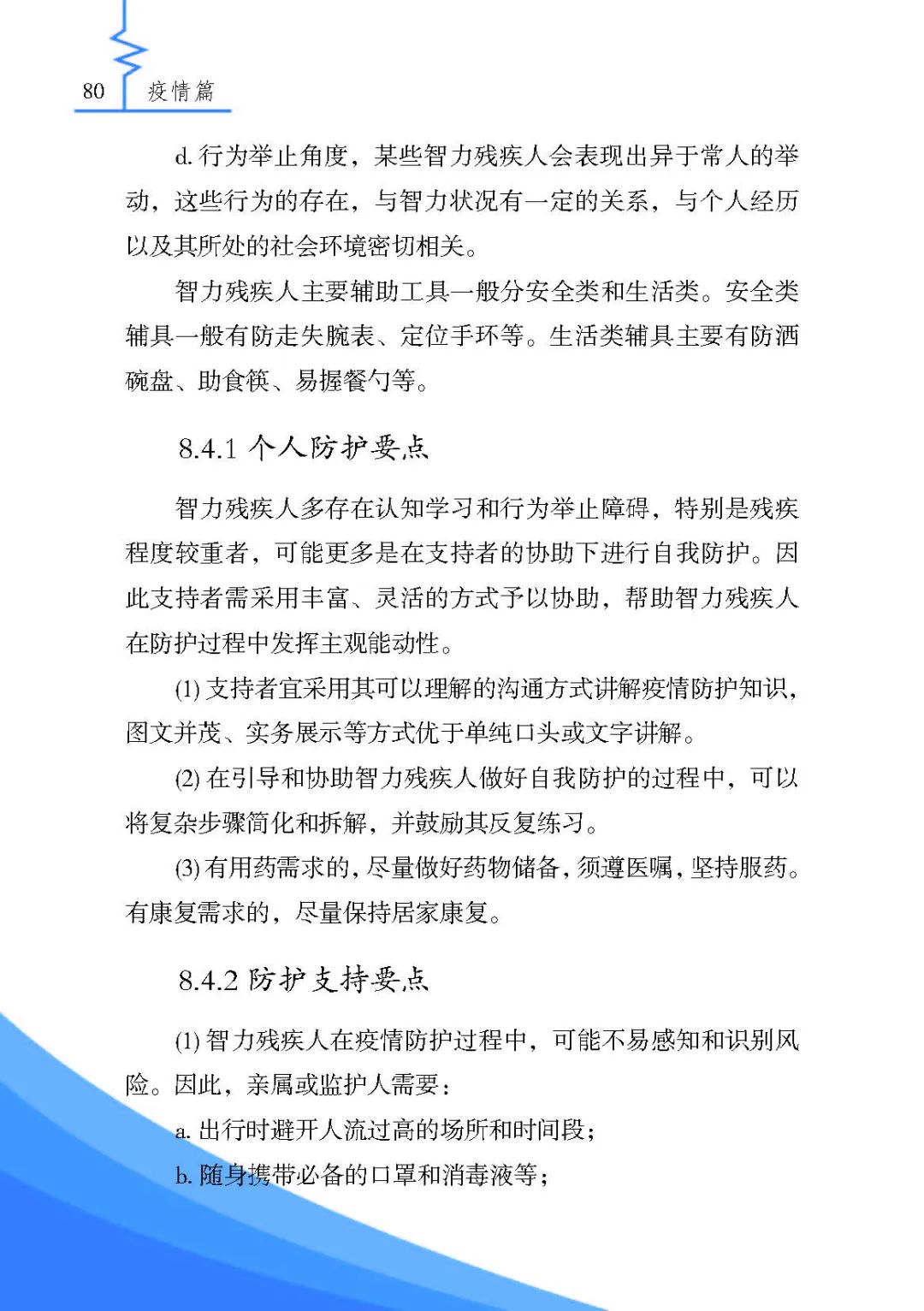 疫情給殘疾人帶來(lái)了身心健康、照護(hù)、經(jīng)濟(jì)等多方面的挑戰(zhàn),日常生活中,殘疾人應(yīng)如何做好防護(hù)呢?為做好殘疾人群體疫情防控工作,幫助殘疾人朋友科學(xué)防疫,當(dāng)好自己健康的第一責(zé)任人,中國(guó)殘疾人聯(lián)合會(huì)組織編寫了《殘疾人安全防護(hù)實(shí)用手冊(cè)·疫情篇》。