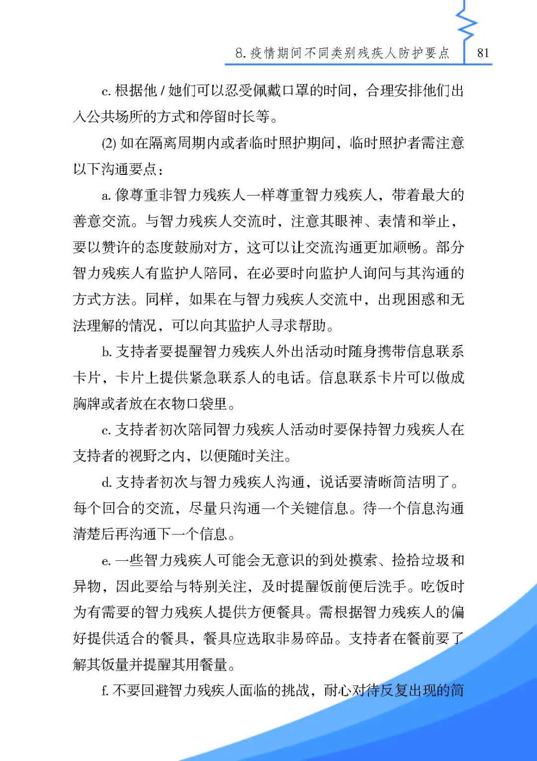 手冊(cè)詳細(xì)地介紹了新冠病毒肺炎及其他重大傳染病疫情帶給殘疾人群體的特殊挑戰(zhàn)和風(fēng)險(xiǎn),提出了殘疾人面對(duì)傳染病疫情開(kāi)展自身防護(hù)應(yīng)當(dāng)遵循的一般性指導(dǎo)原則。今天,福祉君將摘取手冊(cè)中的部分內(nèi)容,希望能給廣大殘疾朋友帶來(lái)一些幫助。