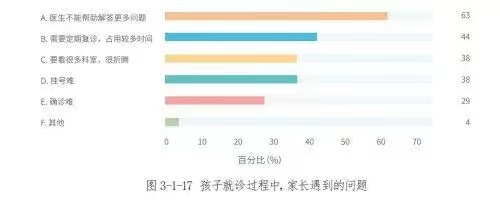 例如,當(dāng)問及診療過程中的困難時,63%的家長認(rèn)為,“醫(yī)生不能解答更多問題”,是就診過程中遇到的最多的困難,44%的家長認(rèn)為,“需要定期復(fù)診,占用較多時間”。“醫(yī)生不能解答更多問題”的原因可能是,兒童發(fā)展障礙的共患病問題較多,很多情況下,單一科室的醫(yī)生難以給予精準(zhǔn)的診斷治療,因此,需要多學(xué)科間的協(xié)作。