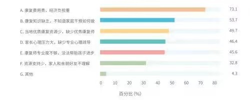 總體來看,康復(fù)費(fèi)用貴、康復(fù)資源少,服務(wù)質(zhì)量不夠高是家長們普遍面臨的問題?!端{(lán)皮書》顯示,73.1%的家長認(rèn)為“康復(fù)費(fèi)用貴,經(jīng)濟(jì)負(fù)擔(dān)重”是主要困難。其次是“康復(fù)知識缺乏,不知道家庭干預(yù)如何開展”,占比 53.7%,以及“當(dāng)?shù)貎?yōu)質(zhì)康復(fù)資源少,缺少優(yōu)秀康復(fù)師”占比 49.7%。
