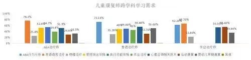 可喜的是,兒童康復(fù)行業(yè)已經(jīng)展現(xiàn)出多學(xué)科精準(zhǔn)康復(fù)的趨勢。從兒童康復(fù)師學(xué)習(xí)需求的角度來看,也呈現(xiàn)出多學(xué)科融合發(fā)展的趨勢。其中,在所調(diào)查的兒童康復(fù)師中,76.3%的ABA治療師希望學(xué)習(xí)言語語言治療技術(shù),占比近8成;72.1%的言語治療師希望學(xué)習(xí)ABA行為分析技術(shù),占比超過7成;同時,分別有66.7%和62.3%的作業(yè)治療師希望學(xué)習(xí)言語語言治療和ABA行為分析技術(shù),超過6成。在兒童康復(fù)學(xué)科越發(fā)細(xì)分,越發(fā)專業(yè)的同時,學(xué)科融合的趨勢也越加明顯。