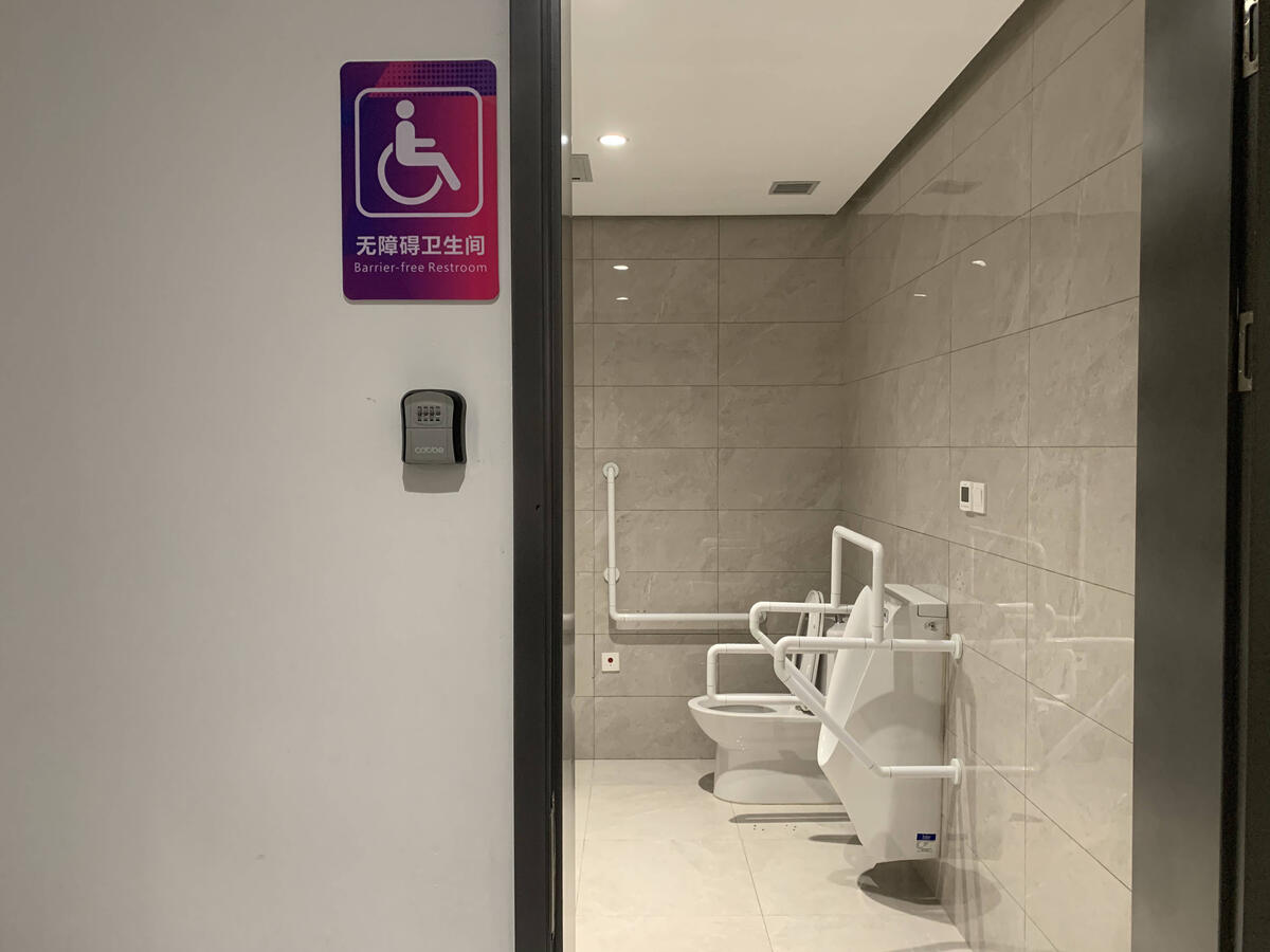 對殘疾人的關懷,還藏在細節(jié)里。今年,三人制籃球館內的無障礙衛(wèi)生間又進行了調整,傾斜的鏡子、高度經過多次調整的扶手和用具,都讓殘疾人和有需要的人群使用更舒心。值得一提的是,衛(wèi)生間門口還有一處不起眼的特別設置。“它是個應急保障措施,這個密碼鎖里面放著一把應急鑰匙,一旦殘疾人自己在衛(wèi)生間發(fā)生意外,工作人員就可以在外面打開門,及時進行救援。”三人制籃球館物業(yè)工作人員燕永會介紹。