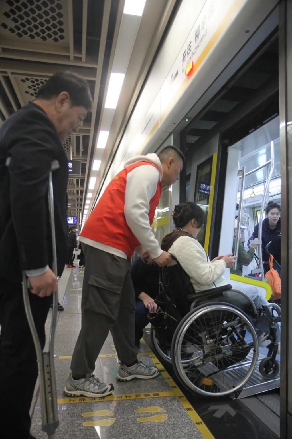 在 2 號線裕華路站,殘疾人朋友在地鐵工作人員及志愿者的引導下通過輪椅坡道乘坐無障礙垂梯進入車站,車站工作人員為殘疾人朋友詳細講解了票務(wù)政策,以及乘車的一系列便利服務(wù),介紹了車站各類無障礙設(shè)備設(shè)施使用方法。