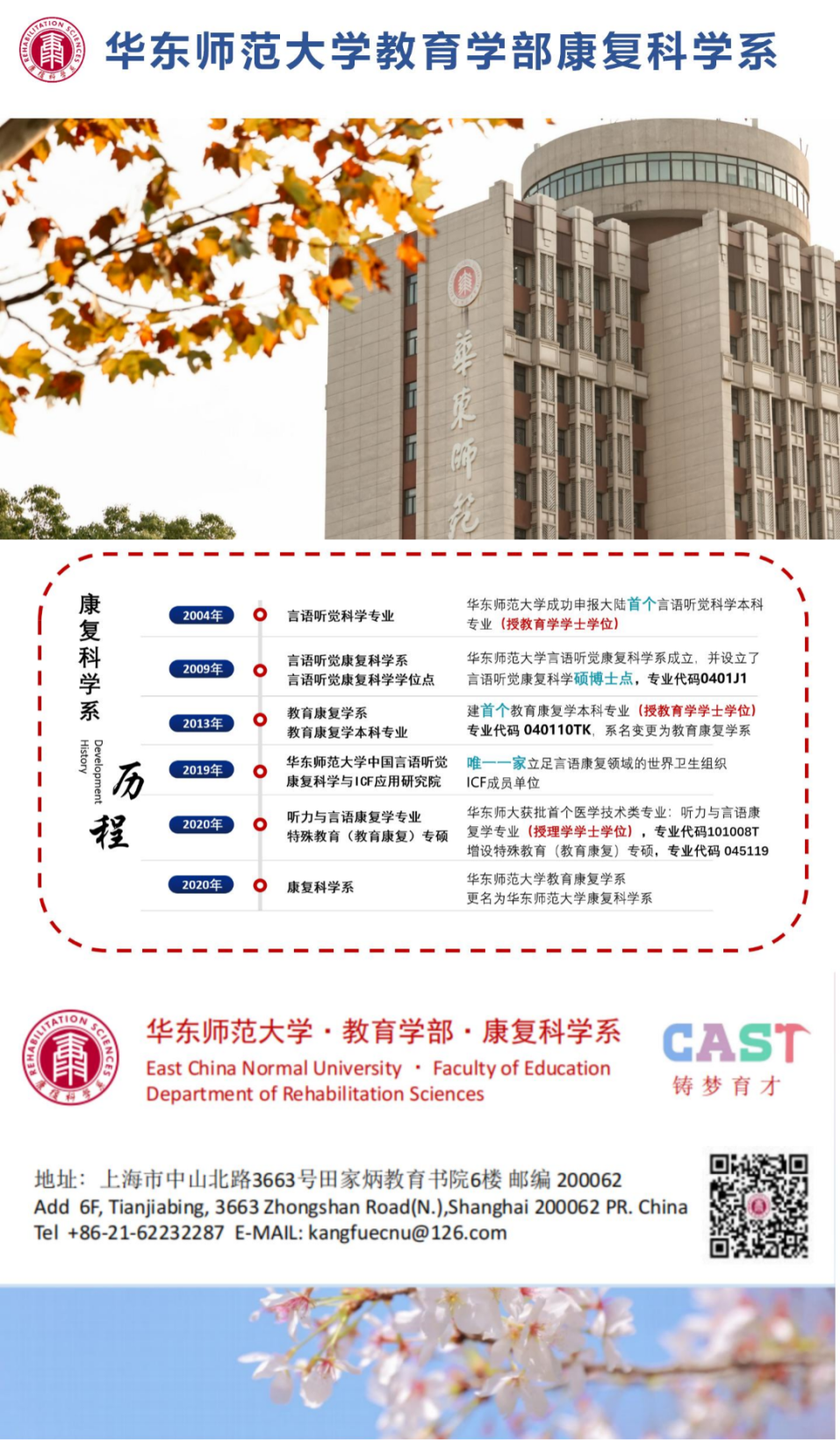 華東師范大學教育學部康復科學系始發(fā)于2004年我國大陸創(chuàng)建的首個言語聽覺科學專業(yè)。經(jīng)過近20年的建設(shè)努力,目前已發(fā)展成為本科、碩士和博士學位授予點齊全的專業(yè),包括教育康復學、聽力與言語康復學兩個本科專業(yè)、言語聽覺康復科學碩博士點,以及特殊教育(教育康復)專業(yè)碩士點。學生就業(yè)方向包括高校、特教學校、耳鼻喉科、口腔科,康復科、兒童保健科、康復機構(gòu)等不同領(lǐng)域。熱忱歡迎海內(nèi)外學子報考本專業(yè)!