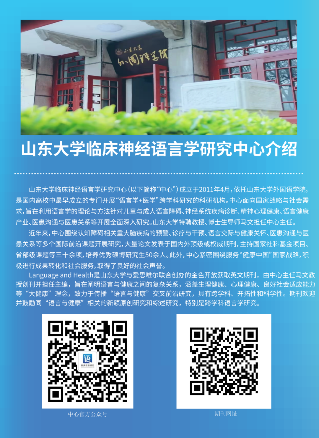 山東大學臨床神經(jīng)語言學研究中心成立于2011年,依托山東大學外國語學院,是國內(nèi)高校中最早成立的專門開展“語言學+醫(yī)學”跨學科研究的科研機構(gòu)。面向國家戰(zhàn)略與社會需求,中心秉承“科研、教學、社會服務并重,產(chǎn)學研一體化發(fā)展”的原則,積極開展臨床語言學研究與實踐,并從語言學的角度積極探索神經(jīng)發(fā)展性疾病、神經(jīng)精神性疾病以及神經(jīng)退行性疾病的診療與康復,力圖在國際臨床語言學發(fā)展背景下,探索出一條具有前沿性、前瞻性兼具本土化的中國臨床語言學發(fā)展之路。