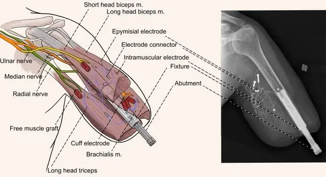 研究團(tuán)隊(duì)在對一位手臂截肢患者進(jìn)行了手術(shù)。他們將新的顯微外科技術(shù)與復(fù)雜的植入電極相結(jié)合,這些電極提供對假肢的單手指控制以及感覺反饋。其中,電極和骨整合接口分別提供與假體的電氣和機(jī)械連接。