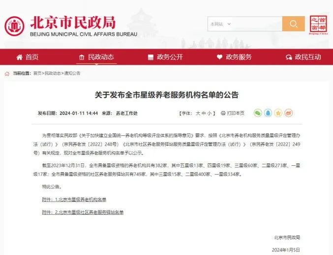 北京市民政局:截至2023年末全市具備星級(jí)資格的養(yǎng)老機(jī)構(gòu)共382家