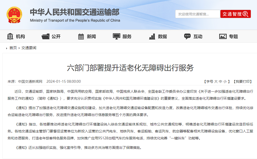 《通知》提出了加強適老化無障礙交通設(shè)施規(guī)劃建設(shè),推動將適老化無障礙出行環(huán)境建設(shè)納入綜合交通運輸體系規(guī)劃,新購置投入運營地鐵列車、客運船舶、鐵路客運列車應(yīng)按照相關(guān)要求,配備有關(guān)無障礙設(shè)施設(shè)備,既有公共交通運輸工具具備改造條件的,應(yīng)進(jìn)行無障礙改造等要求。