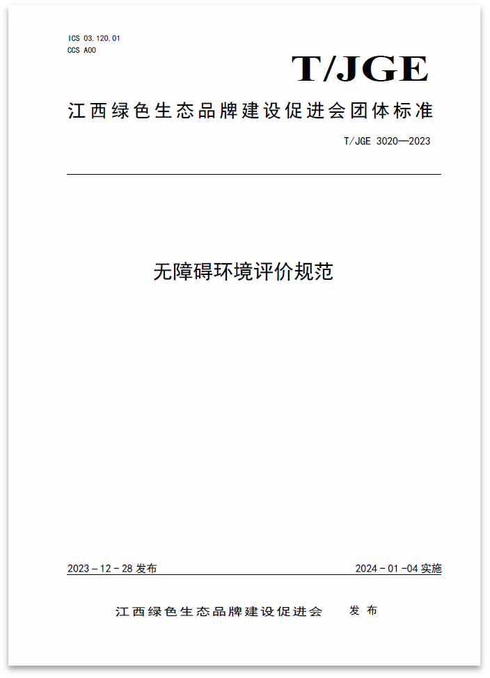 近期,《無障礙環(huán)境評價(jià)規(guī)范》(T/JGE 3020-2023)團(tuán)體標(biāo)準(zhǔn)正式發(fā)布,該標(biāo)準(zhǔn)由江西省質(zhì)標(biāo)院聯(lián)合撫州市殘疾人聯(lián)合會(huì)、中國船級社質(zhì)量認(rèn)證有限公司等單位共同參與起草。