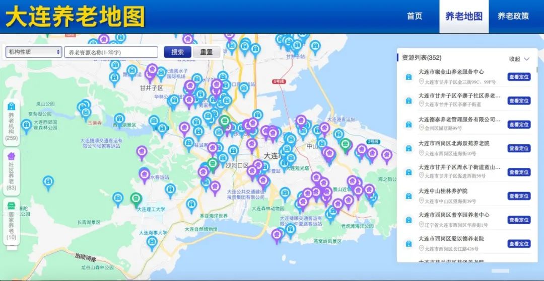 大連市首個全方位展示養(yǎng)老服務機構信息的“一站式”智慧服務平臺——大連養(yǎng)老地圖近日正式上線運行。養(yǎng)老地圖全面涵蓋各類養(yǎng)老服務設施,主要由“機構養(yǎng)老”“社區(qū)養(yǎng)老”“居家養(yǎng)老”三個板塊構成,可以輕松查找到各類養(yǎng)老服務中心相關信息。
