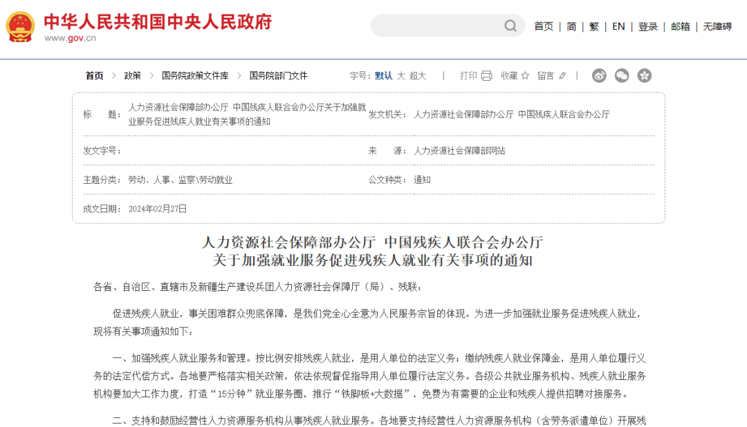 人力資源和社會保障部辦公廳、中國殘疾人聯合會辦公廳近日聯合印發(fā)《關于加強就業(yè)服務促進殘疾人就業(yè)有關事項的通知》。