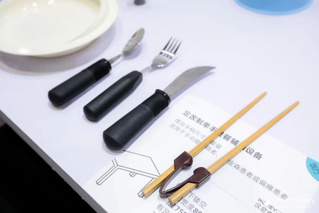 特制餐勺筷子:彎曲餐勺,只需轉(zhuǎn)動(dòng)手腕就能輕松取食;電動(dòng)防抖勺,在高速抖動(dòng)下,勺中的食物依然可以保持不掉;加重易握餐具等……使老年人能夠靈活自主進(jìn)食。