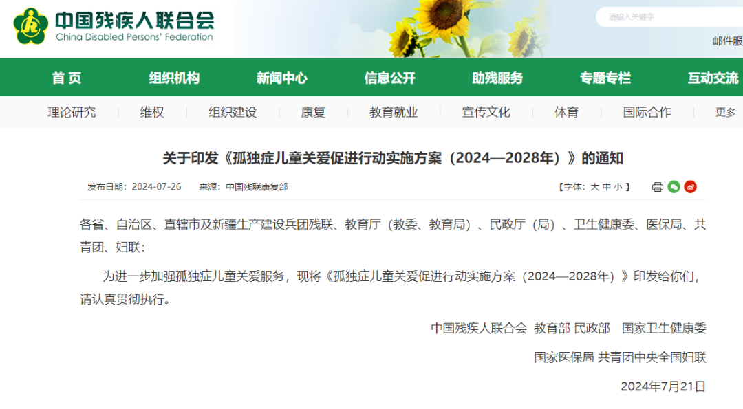 中國(guó)殘聯(lián),印發(fā)《孤獨(dú)癥兒童關(guān)愛促進(jìn)行動(dòng)實(shí)施方案(2024-2028年)》https://www.cdpf.org.cn/zwgk/zcwj/wjfb/e9e23982df5248e3b0d82d180c368996.htm