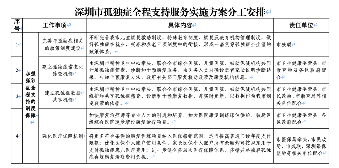 在此之前,深圳市已于2023年10月印發(fā)《深圳市孤獨(dú)癥全程支持服務(wù)實(shí)施方案》,提出六大方面31項(xiàng)工作任務(wù),希望實(shí)現(xiàn)的工作目標(biāo)是: