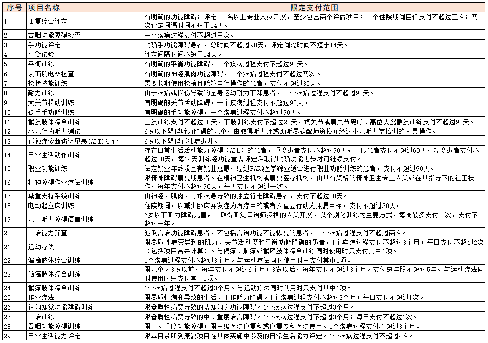 另外19個(gè)醫(yī)療康復(fù)項(xiàng)目放到了康復(fù)科,其中,運(yùn)動(dòng)療法、作業(yè)療法和平衡訓(xùn)練的支付期限都提高到了180天。
