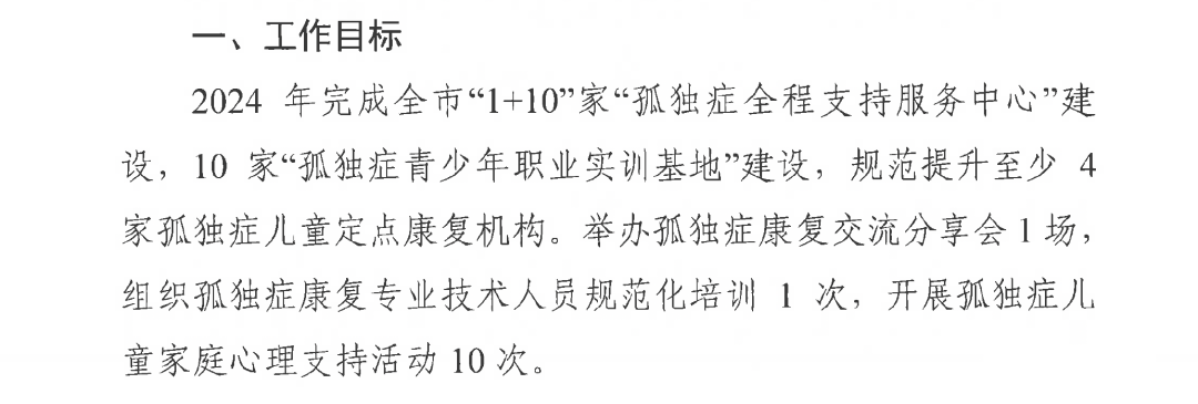 “持續(xù)提升孤獨(dú)癥早期篩查、診斷、康復(fù)水平,推進(jìn)孤獨(dú)癥兒童融合教育,促進(jìn)成年孤獨(dú)癥就業(yè),加強(qiáng)重癥孤獨(dú)癥托養(yǎng),做好孤獨(dú)癥民生兜底保障和無障礙環(huán)境建設(shè),建立完善我市孤獨(dú)癥全程支持服務(wù)體系。”