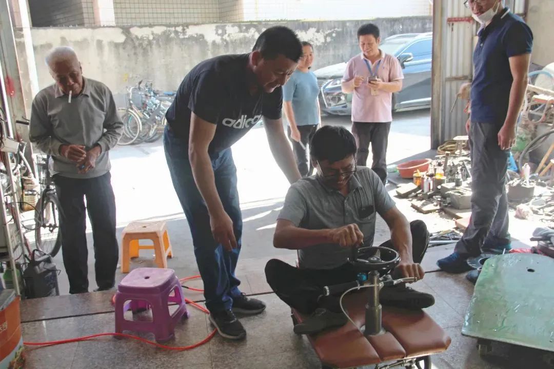 這種低位助力車的坐墊與地面的距離只有幾十厘米,設(shè)置手搖輪等傳動(dòng)裝置控制方向與移動(dòng)。適配該輔助器具后,林阿伯不必他人攙扶即可自行使用,且滿足了他的工作需要,方便維修。