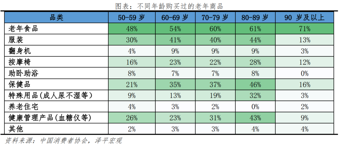 2)分年齡看,低齡老人需要消費、社交、娛樂,高齡老人需要照護服務,長壽老人關注身體機能變化等方面。傳統(tǒng)老年人口劃分為60歲及以上或65歲及以上人口,如果考慮備老人群,可把銀發(fā)群體擴展到50歲及以上人群。按年齡劃分,銀發(fā)群體可分為準老人(50-64歲)、低齡老人(65-74歲)、高齡老人(75-89歲)、長壽老人(90歲及以上)。年齡階段不同,老年群體的需求也不盡相同,其中準老人處于職業(yè)生涯晚期,身體相對健康,即將退休,重點關注文娛、抗衰老等方面;低齡老人剛步入退休階段,處于退休適應期,重點關注健康管理、娛樂社交等方面,對短途旅行、老年大學等方面的需求增加;高齡老人身體機能減退,自理能力減弱,更加關注醫(yī)療保健、養(yǎng)老服務等方面;長壽老人更加注重精神層面需求,安享晚年生活。