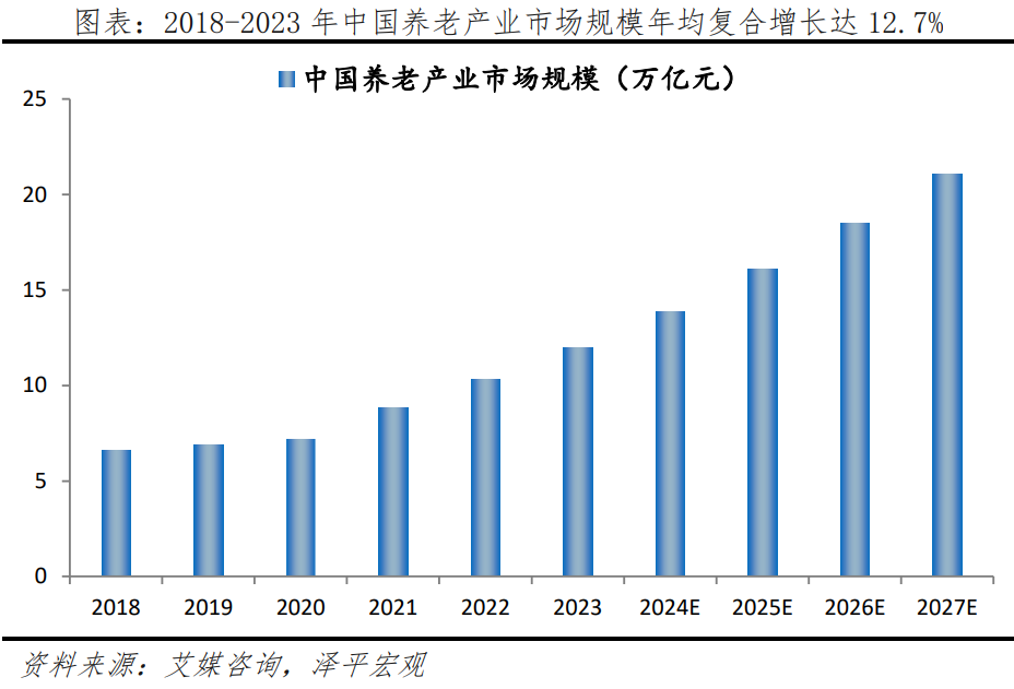 隨著人口老齡化時代到來,為滿足中老年人群體在衣、食、住、行、醫(yī)等方面需求,銀發(fā)經(jīng)濟市場潛力巨大,預計到2050年,老年人口消費總量將占中國GDP的21%。新一代中老年人群教育水平普遍較高,他們在退休后更重視生活質(zhì)量和社交活動,愿意為自己興趣和愛好買單,這為銀發(fā)經(jīng)濟市場蓬勃發(fā)展提供堅實基礎。據(jù)艾媒咨詢、中國老齡科學研究中心數(shù)據(jù),2018-2023年,中國養(yǎng)老產(chǎn)業(yè)市場規(guī)模年均復合增長率達12.7%,預計2050年老年人口消費總量為40萬-69萬億元,占全國GDP的20.7%。
