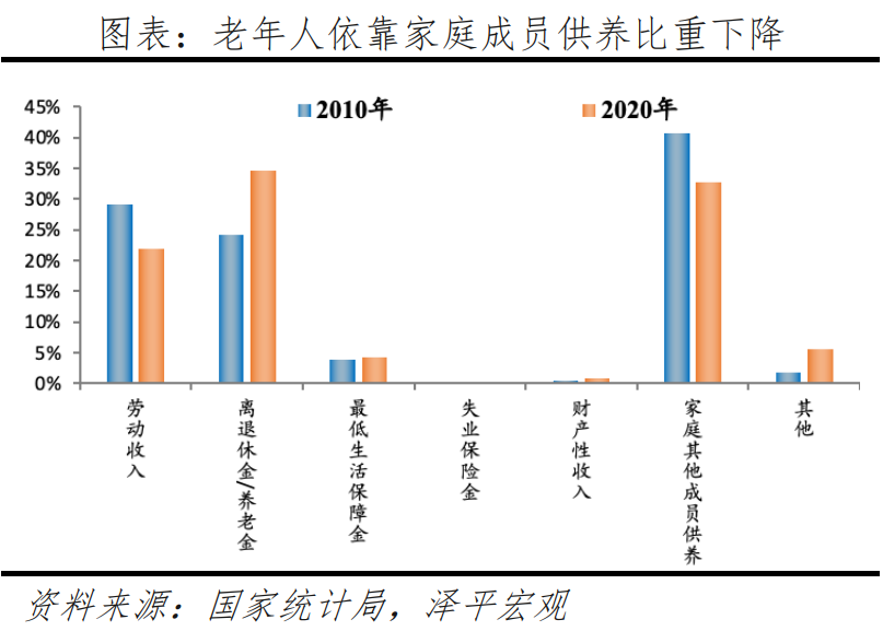 3)居住獨立、經(jīng)濟獨立,空巢老人占比超5成,2010-2020年依靠家庭供養(yǎng)比例從40.7%降至32.7%。隨著傳統(tǒng)觀念轉(zhuǎn)變,疊加家庭規(guī)模不斷縮小、子女數(shù)量下降、人口流動加快,老年人更多選擇不與成年子女同住。根據(jù)七普數(shù)據(jù),全國有39.7%的老年人與子女同住,55.7%的老年人只與配偶同住或者獨居。分城鄉(xiāng)看,城市、鎮(zhèn)、鄉(xiāng)村獨居老人占比分別為52.2%、53%、59.4%,由于農(nóng)村大量年輕勞動力外出務工或定居更發(fā)達地區(qū),更多老年人獨居在家。此外,隨著社會保障體系逐漸完善,更多老年人依靠離退休金生活,經(jīng)濟條件更加獨立。根據(jù)人口普查數(shù)據(jù),2010-2020年,60歲及以上人口中,依靠離退休金/養(yǎng)老金的占比從24.1%增至34.7%,依靠家庭其他成員供養(yǎng)的占比從40.7%降至32.7%。