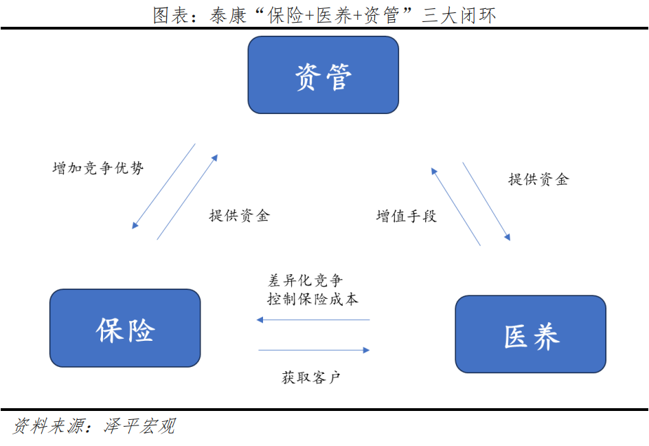 泰康通過跨界醫(yī)養(yǎng)產(chǎn)業(yè)布局,實現(xiàn)虛擬保險產(chǎn)品與實際醫(yī)養(yǎng)服務結(jié)合,構(gòu)建“保險+醫(yī)養(yǎng)+資管”三大閉環(huán)。泰康之家定位于高端養(yǎng)老服務,致力于打造“都市醫(yī)養(yǎng)社區(qū)”??蛻敉ㄟ^購買泰康指定的養(yǎng)老保險產(chǎn)品,可在泰康的養(yǎng)老體系中享受養(yǎng)老服務;通過購買健康保險產(chǎn)品,可在泰康的醫(yī)療健康體系中獲得醫(yī)療服務;資產(chǎn)管理則為客戶的健康和養(yǎng)老需求儲備物質(zhì)財富。通過閉環(huán)整合,泰康之家有效控制保險成本,提升保險產(chǎn)品的市場競爭力。