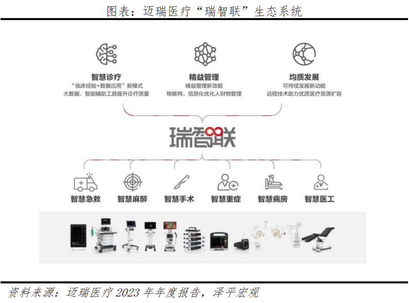 多元發(fā)展構(gòu)筑戰(zhàn)略縱深。1)2024年1月,收購惠泰醫(yī)療,快速進入電生理和血管介入等高值耗材領域。2)基于領先的腔鏡平臺,加速提升耗材市場份額,邁瑞在“設備+耗材”品類有較強的優(yōu)勢和研發(fā)基因。3)拓展動物醫(yī)療,面向不同動物以及應用場景,建立體外診斷、生命信息與支持、醫(yī)學影像技術研究平臺。