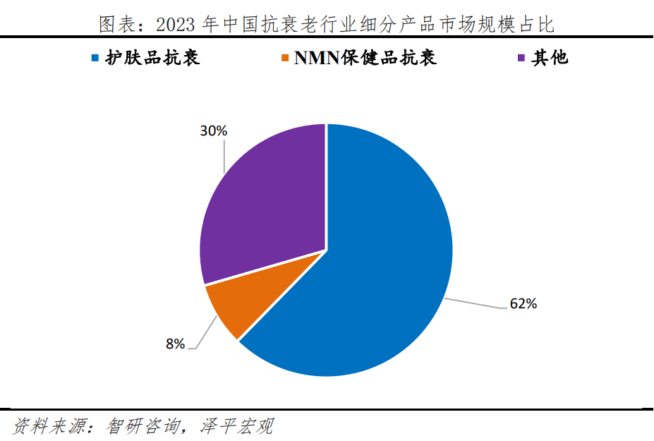 抗衰領域,隨著生活方式和化妝習慣變化,銀發(fā)族對永葆青春渴望推動抗衰老產(chǎn)品銷售增長,預計2024年中國抗衰市場規(guī)模達1500億元。2024年1月,國務院發(fā)布的《關于發(fā)展銀發(fā)經(jīng)濟增進老年人福祉的意見》中強調(diào):“發(fā)展抗衰老產(chǎn)業(yè),推動生物技術與延緩老年病深度融合,開發(fā)老年病早期篩查產(chǎn)品和服務。”當前,消費者對抗衰老護膚品的需求日益多元化,市場消費熱情持續(xù)高漲。根據(jù)智研咨詢數(shù)據(jù),2023年中國抗衰老行業(yè)市場規(guī)模約為1522億元,其中,護膚品抗衰老、NMN保健品抗衰、其他抗衰產(chǎn)品占比分別為62%、30%、8%。隨著抗衰老護膚品和保健品成分的迭代升級,越來越多消費者認可抗衰成分的有效性,并通過使用護膚品和保健品進行抗衰老。根據(jù)艾媒咨詢數(shù)據(jù),目前,68.2%的消費者通過健身進行抗衰老,62.4%的消費者使用護膚品,近五成的消費者注重飲食和服用保健品。