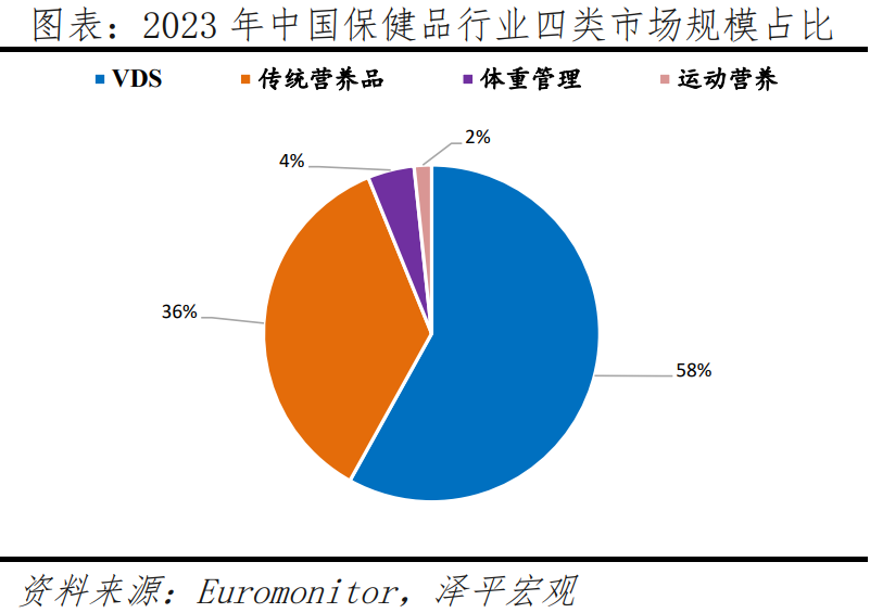 膳食補充劑占保健品市場主導地位,中老年人更偏好鈣片、奶粉、維生素和葉黃素等產(chǎn)品。保健品市場主要分為維生素和膳食補充劑(VDS)、運動營養(yǎng)品、體重管理和傳統(tǒng)滋補四大類。根據(jù)Euromonitor數(shù)據(jù),2023 年VDS 市場規(guī)模占中國保健品行業(yè)近60%,消費者主要出于日常增強免疫力的需求選擇VDS產(chǎn)品。其中,鈣片、奶粉、魚油、維生素、葉黃素等品類尤其受到中老年人的歡迎。例如,隨著年齡增長,老年人對營養(yǎng)的需求變化,專為老年人設計的高鈣奶粉、富含多種維生素和礦物質(zhì)的營養(yǎng)麥片、深海魚油等保健食品,有助于補充所需營養(yǎng),維持身體健康。對于患有慢性疾病或身體虛弱的老年人,膳食補充劑如維生素D、益生菌等,可以幫助他們更好地攝取營養(yǎng),增強免疫力。從市占率看,根據(jù)Euromonitor數(shù)據(jù),2023年湯臣倍健在VDS市場的市占率為10.4%,穩(wěn)居行業(yè)龍頭,其次是安利與健合集團,前十企業(yè)市場集中度低于40%,我國保健品市場仍具有較大的整合和發(fā)展空間。(膳食補充劑是含有維生素、礦物質(zhì)、草藥或其它植物產(chǎn)品或氨基酸的產(chǎn)品(除煙草之外)。)