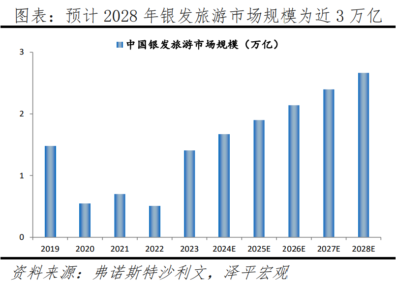 展望未來,隨著60、70后“黃金一代”逐漸步入老齡化,中高端旅游產(chǎn)品將迎來更多發(fā)展機遇,旅游服務重要性愈發(fā)凸顯,預計2028年,銀發(fā)旅游市場規(guī)模將達約2.7萬億元,2024-2028年年均復合增速將達12.4%。
