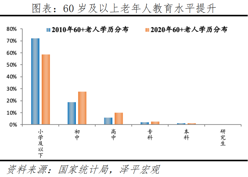 教育水平方面,2010-2020年,60歲及以上人口中,擁有高中及以上文化程度的占比從9.1%提升至13.9%。隨著人口整體受教育水平提升,后續(xù)步入老齡的人口文化素質(zhì)更高,將帶動整體老年群體受教育水平提升。