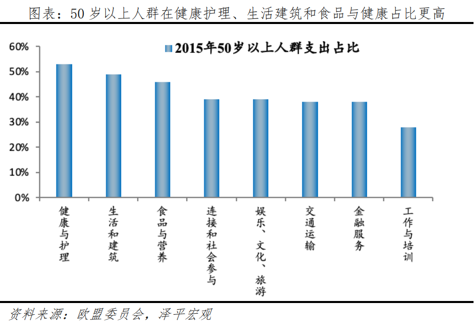 歐洲銀發(fā)經(jīng)濟發(fā)展主要集中于以下三個方面:1)基本功能性產(chǎn)品。為老年人營造友好環(huán)境,將無障礙設施以及老年人所需要的產(chǎn)品和服務納入主流市場。比如醫(yī)療健康、綜合護理服務等。2)生活方式相關產(chǎn)品。在工作、生活、住房、休閑、旅行、交通等方面,滿足不同老年群體需求。比如老年友好型大學、適老化住房、功能性食品、個性化營養(yǎng)方案、銀發(fā)旅游等。3)升級附加類產(chǎn)品。進行科技化、智能化升級,進而拉動新興市場。比如智能家居、健康管理、安全監(jiān)護、遠程護理、服務機器人等。根據(jù)歐盟委員會《銀發(fā)經(jīng)濟》報告,2015年50歲以上人群支出占比前三名的行業(yè)是健康護理、生活建筑和食品與健康,分別為53%、49%、46%。