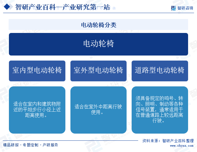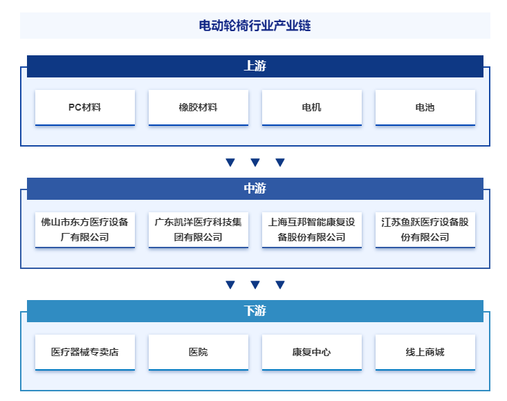 電動輪椅產(chǎn)業(yè)鏈上游為PC材料、橡膠材料、鋁合金、電機(jī)、電池、控制器、傳感器等。產(chǎn)業(yè)鏈中游為電動輪椅的生產(chǎn)制造商。產(chǎn)業(yè)鏈下游為醫(yī)療器械專賣店、醫(yī)院、康復(fù)中心、線上商城等。終端用戶包括老年人、殘疾人、傷病恢復(fù)者等需要輔助移動的群體。