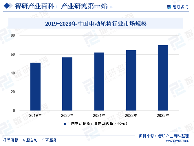 隨著全球人口老齡化的不斷加劇以及殘疾人口數(shù)量的穩(wěn)步增長,電動輪椅車的需求正呈現(xiàn)出顯著的增長趨勢。面對行動不便的困境,越來越多的老年人開始依賴電動輪椅作為他們?nèi)粘I钪械闹匾焦ぞ?,而殘疾人群體更是迫切需要電動輪椅來滿足他們的出行需求。2023年中國電動輪椅行業(yè)市場規(guī)模為69.72億元,同比增長8.13%。隨著國內(nèi)老齡化問題的日益凸顯,預(yù)計對電動輪椅車的需求將持續(xù)增加,從而推動整個行業(yè)市場規(guī)模的進(jìn)一步上漲。