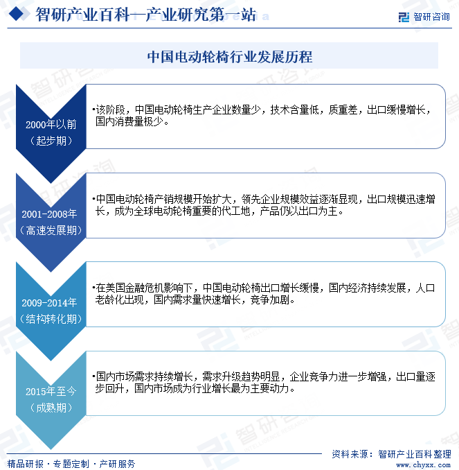 中國電動輪椅行業(yè)發(fā)展主要經(jīng)歷了四個階段。2000年以前的起步期,中國電動輪椅生產(chǎn)企業(yè)數(shù)量少,技術(shù)含量低,質(zhì)量差,出口緩慢增長,國內(nèi)消費量極少。2001-2008年的高速發(fā)展期,中國電動輪椅產(chǎn)銷規(guī)模開始擴(kuò)大,領(lǐng)先企業(yè)規(guī)模效益逐漸顯現(xiàn),出口規(guī)模迅速增長,成為全球電動輪椅重要的代工地,產(chǎn)品仍以出口為主。2009年至2014年的結(jié)構(gòu)轉(zhuǎn)化期,在美國金融危機(jī)影響下,中國電動輪椅出口增長緩慢,國內(nèi)經(jīng)濟(jì)持續(xù)發(fā)展,人口老齡化出現(xiàn),國內(nèi)需求量快速增長,競爭加劇。2015年至今的成熟期,國內(nèi)市場需求持續(xù)增長,需求升級趨勢明顯,企業(yè)競爭力進(jìn)一步增強(qiáng),出口量逐步回升,國內(nèi)市場成為行業(yè)增長最為主要動力。