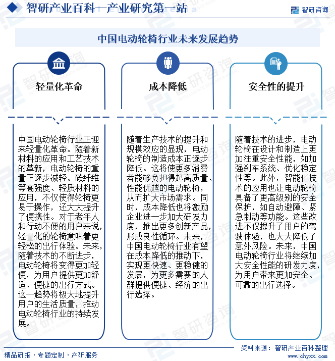 隨著中國人口老齡化的逐漸加劇,對電動輪椅等康復(fù)輔助器具的需求持續(xù)增長。國家通過相關(guān)政策推動康復(fù)醫(yī)療與康復(fù)輔助器具配置服務(wù)的銜接融合,為電動輪椅等產(chǎn)品的市場需求提供了有力保障。2024年1月,國務(wù)院印發(fā)《關(guān)于發(fā)展銀發(fā)經(jīng)濟(jì)增進(jìn)老年人福祉的意見》,提出大力發(fā)展康復(fù)輔助器具產(chǎn)業(yè)。推動助聽器、矯形器、拐杖、假肢等傳統(tǒng)功能代償類康復(fù)輔助器具升級,發(fā)展智能輪椅、移位機(jī)、康復(fù)護(hù)理床等生活照護(hù)產(chǎn)品。在政策推動下,電動輪椅行業(yè)將加快技術(shù)創(chuàng)新和產(chǎn)品升級。隨著政策的推動和市場需求的增長,電動輪椅行業(yè)將逐漸實現(xiàn)標(biāo)準(zhǔn)化和規(guī)范化發(fā)展。這將有助于提升產(chǎn)品的質(zhì)量和安全性,降低生產(chǎn)成本和售價,進(jìn)一步促進(jìn)市場的擴(kuò)大和普及。