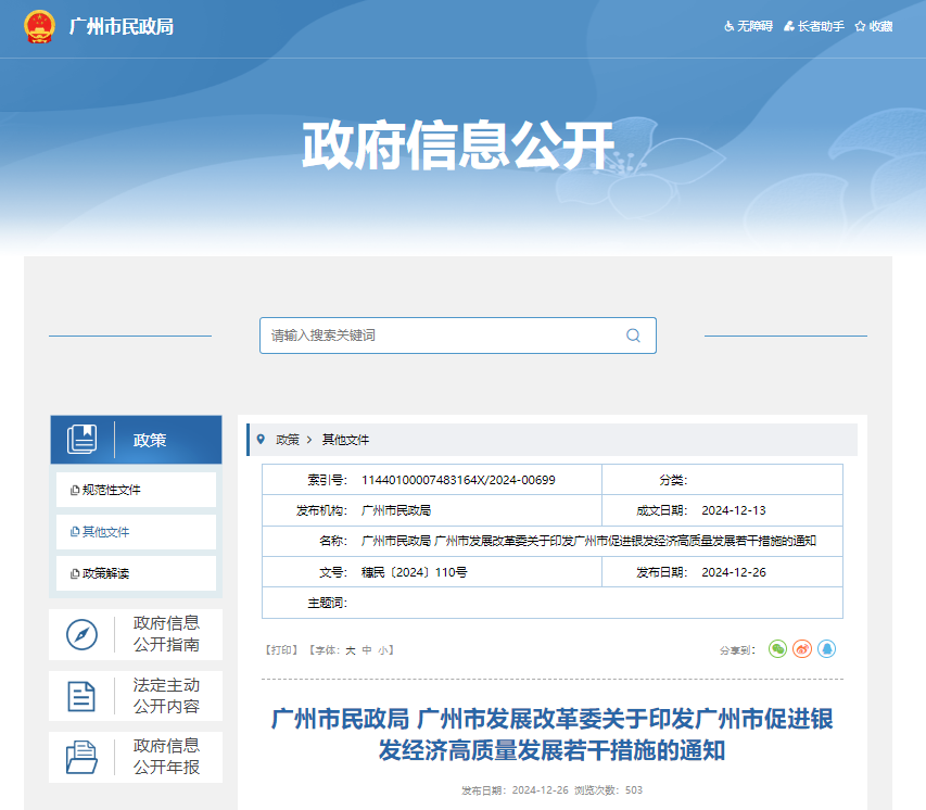 近日,經(jīng)廣州市人民政府同意,《廣州市民政局 廣州市發(fā)展改革委關(guān)于印發(fā)廣州市促進銀發(fā)經(jīng)濟高質(zhì)量發(fā)展若干措施的通知》(穗民〔2024〕110號,下稱《措施》)正式出臺?!洞胧穼?biāo)對表《國務(wù)院辦公廳關(guān)于發(fā)展銀發(fā)經(jīng)濟增進老年人福祉的意見》26項舉措和7大潛力產(chǎn)業(yè),結(jié)合我市重點產(chǎn)業(yè)審視、業(yè)務(wù)圖譜初步成果和老年人需求深化調(diào)研成果,聚焦老年人高頻需求和我市優(yōu)勢產(chǎn)業(yè),從民生事業(yè)、重點賽道和支撐保障三個方面提出10條操作性強的措施。