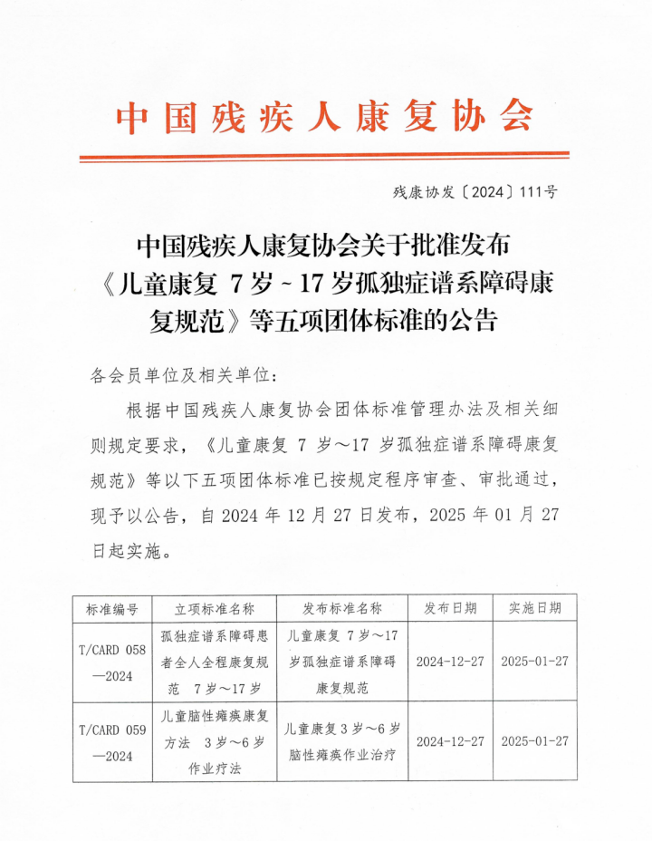 近日,中國殘疾人康復(fù)協(xié)會發(fā)布關(guān)于批準(zhǔn)發(fā)布《兒童康復(fù)7歲~17歲孤獨癥譜系障礙康復(fù)規(guī)范》等五項團體標(biāo)準(zhǔn)的公告。公告稱《兒童康復(fù)7歲~17歲孤獨癥譜系障礙康復(fù)規(guī)范》等五項團體標(biāo)準(zhǔn)已按規(guī)定程序?qū)彶椤徟ㄟ^,自2024年12月27日發(fā)布,2025年1月27日起實施。