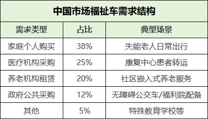 雖然普及度低,但實際上殘疾人和老年人對福祉車的需求相當(dāng)強(qiáng)烈。目前家庭個人購買福祉車的需求占比38%,其次是醫(yī)療機(jī)構(gòu)采購、養(yǎng)老機(jī)構(gòu)租賃等。