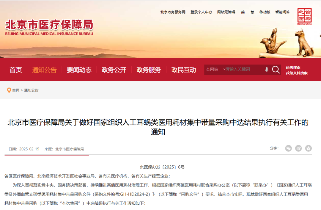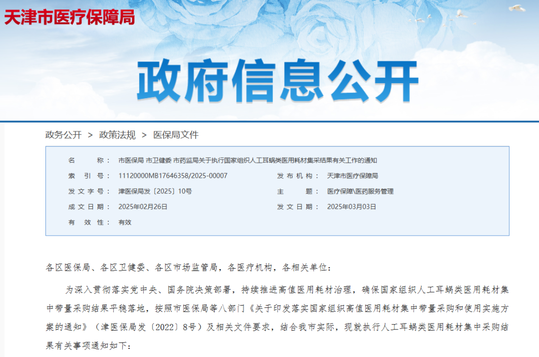 3月3日,天津市醫(yī)保局聯(lián)合有關(guān)部門(mén)發(fā)布了《關(guān)于執(zhí)行國(guó)家組織人工耳蝸類(lèi)醫(yī)用耗材集采結(jié)果有關(guān)工作的通知》,自3月1日起,天津市相關(guān)患者可以使用上集采降價(jià)后的人工耳蝸中選產(chǎn)品,標(biāo)志著國(guó)家集采人工耳蝸中選結(jié)果在津正式落地。