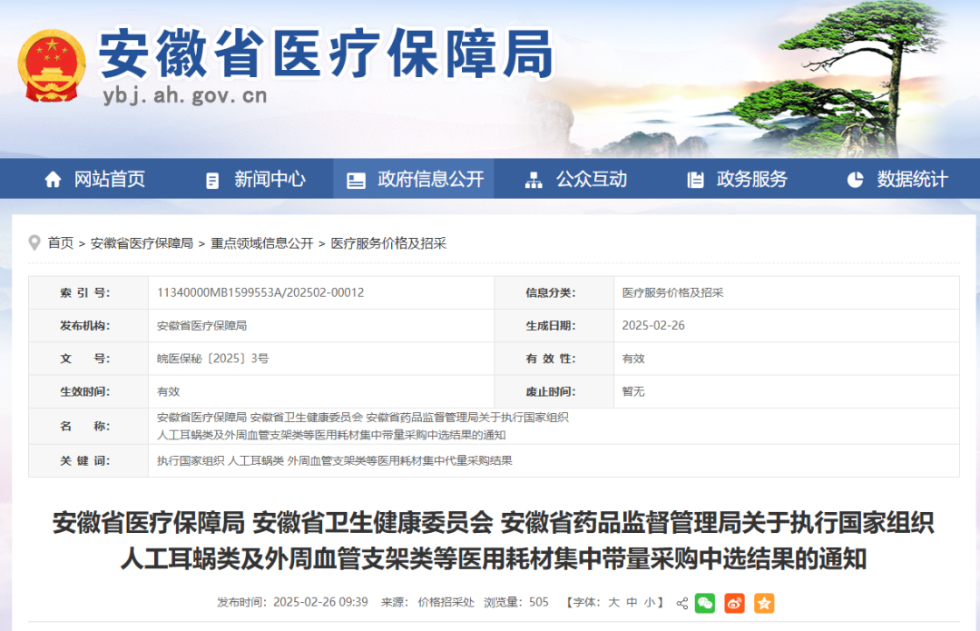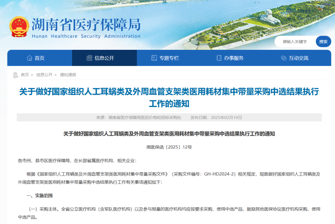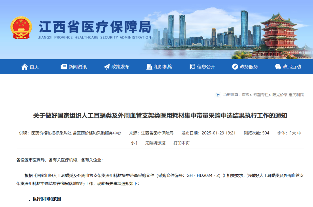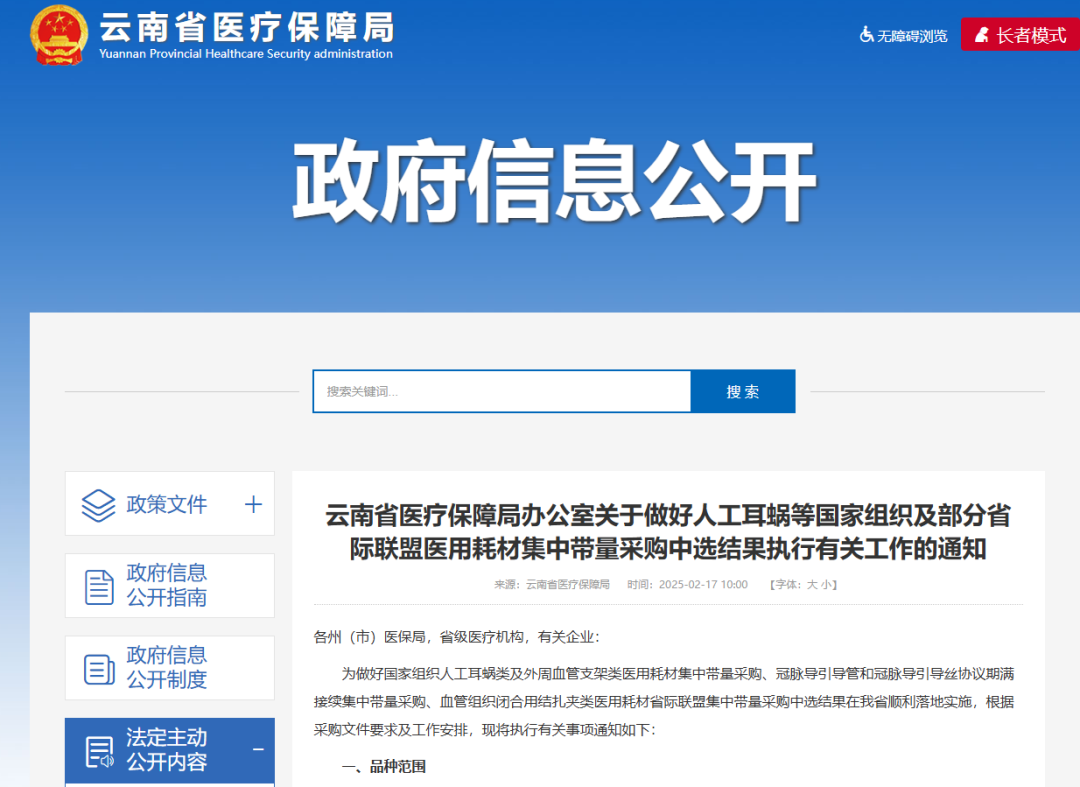 2月7日,云南省醫(yī)療保障局正式發(fā)布《云南省醫(yī)療保障局辦公室關(guān)于做好人工耳蝸等國(guó)家組織及部分省際聯(lián)盟醫(yī)用耗材集中帶量采購(gòu)中選結(jié)果執(zhí)行有關(guān)工作的通知》,規(guī)定國(guó)家組織人工耳蝸類(lèi)醫(yī)用耗材集中帶量采購(gòu)、冠脈導(dǎo)引導(dǎo)管和冠脈導(dǎo)引導(dǎo)絲協(xié)議期滿(mǎn)接續(xù)集中帶量采購(gòu)、血管組織閉合用結(jié)扎夾類(lèi)醫(yī)用耗材省際聯(lián)盟集中帶量采購(gòu)中選結(jié)果自2025年3月1日起執(zhí)行。