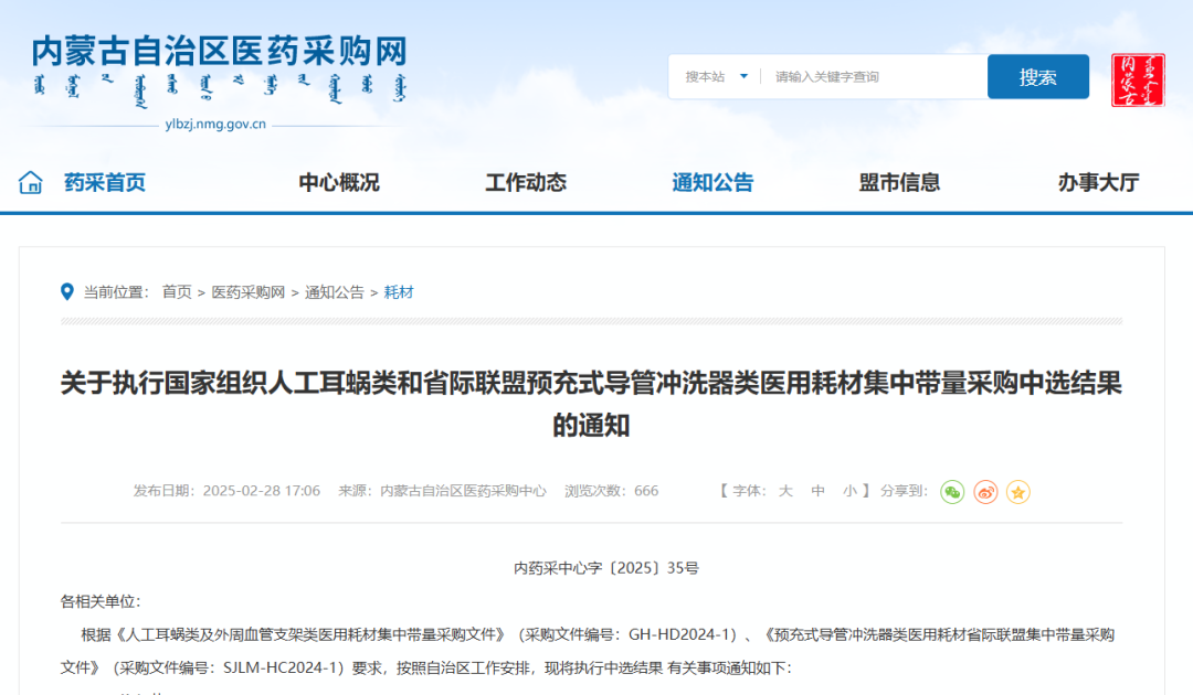 2月28日,內(nèi)蒙自治區(qū)醫(yī)藥采購(gòu)中心發(fā)布《關(guān)于執(zhí)行國(guó)家組織人工耳蝸類(lèi)和省際聯(lián)盟預(yù)充式導(dǎo)管沖洗器類(lèi)醫(yī)用耗材集中帶量采購(gòu)中選結(jié)果的通知》,其中指出,本次人工耳蝸類(lèi)、預(yù)充式導(dǎo)管沖洗器類(lèi)醫(yī)用耗材中選結(jié)果3月15日起正式執(zhí)行,集中帶量采購(gòu)的采購(gòu)周期分別為3年、1年。