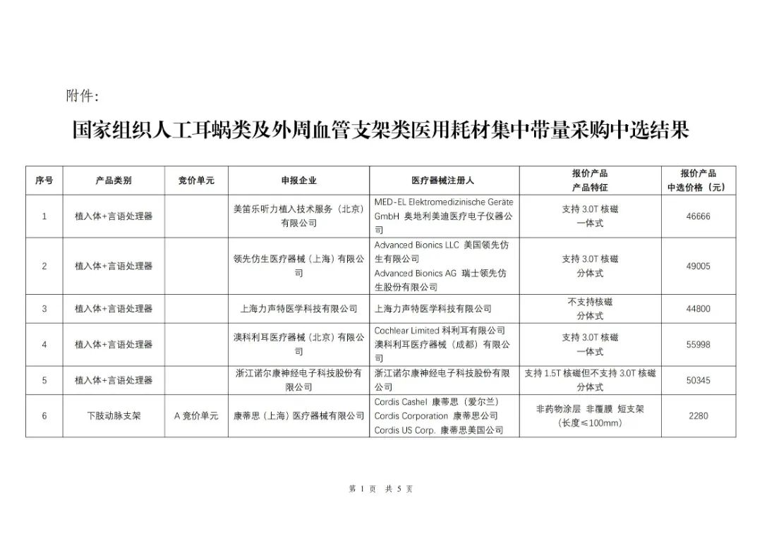 其中,人工耳蝸類(lèi)集采中選結(jié)果自3月1日起執(zhí)行,外周血管支架類(lèi)集采中選結(jié)果自5月1日起執(zhí)行,兩類(lèi)耗材采購(gòu)周期均為3年。