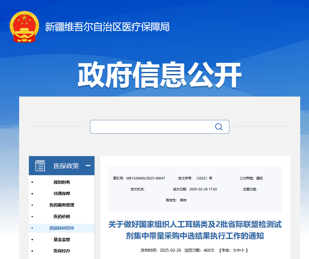 3月3日,新疆維吾爾自治區(qū)醫(yī)療保障局發(fā)布通知,明確自2025年3月1日起正式執(zhí)行人工耳蝸集中帶量采購(gòu)中選結(jié)果,并于3月15日同步落地安徽2023年體外診斷試劑、江西腎功和心肌酶生化類(lèi)檢驗(yàn)試劑集采成果。