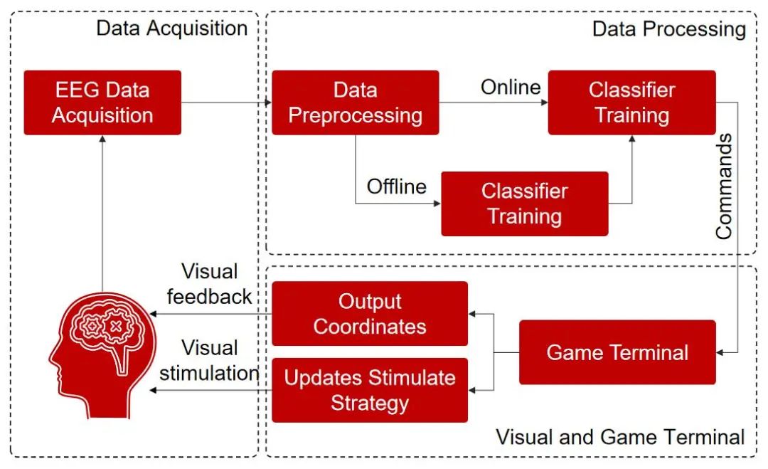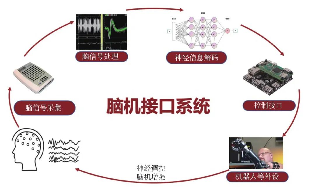 而腦機(jī)接口系統(tǒng)作為一種多學(xué)科交叉融合的復(fù)雜體系,其集成了神經(jīng)科學(xué)、信號(hào)處理、計(jì)算機(jī)科學(xué)、人工智能等多學(xué)科知識(shí),無論是侵入式還是非侵入式的腦機(jī)接口技術(shù),其系統(tǒng)都主要由用戶(大腦)、腦信號(hào)采集、腦信號(hào)處理與解碼、控制接口、機(jī)器人等外設(shè)和神經(jīng)反饋構(gòu)成。其中,最核心的組件是腦信號(hào)采集、腦信號(hào)處理與解碼以及控制接口三部分。