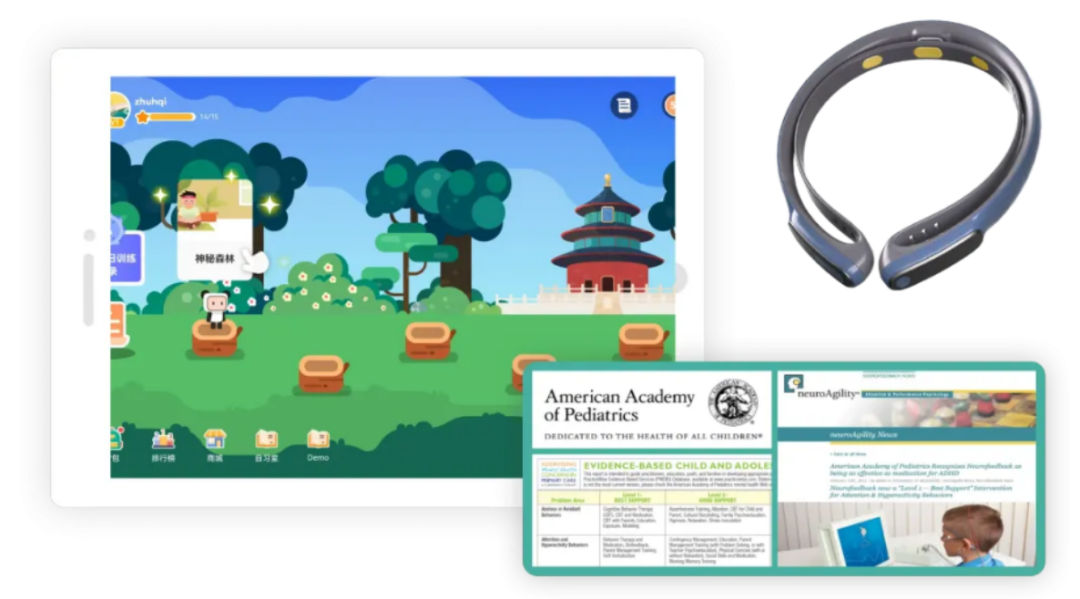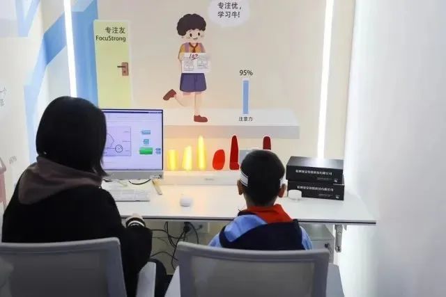 強(qiáng)腦科技旗下的專注欣腦機(jī)接口注意力訓(xùn)練系統(tǒng)則由便攜式腦電設(shè)備、訓(xùn)練軟件“專注欣”App、后臺(tái)管理系統(tǒng)三個(gè)部分組成,可幫助兒童有效改善和提升注意力、反應(yīng)力、自控力和記憶力。